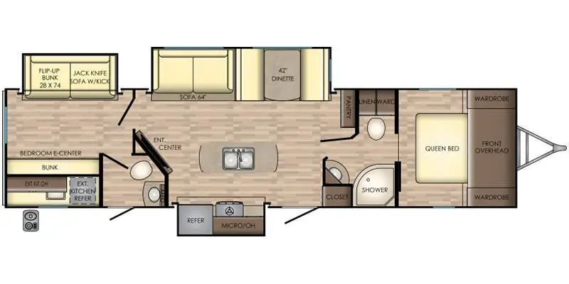 Step inside the 331BH and you’ll find a well‑laid‑out interior anchored by a central combined kitchen and living area. Opposing slide‑outs typically house the kitchen amenities — including a three‑burner range, microwave, double‑door refrigerator, and a center island with a double sink — while the other slide opens up to offer a U‑shaped dinette and sofa that create a comfortable social zone for dining, relaxing, or watching TV. A convenient walk‑through full bathroom separates the main living area from the private front bedroom, which usually features a queen‑size bed with wardrobes and overhead storage.
