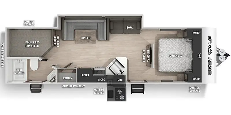 Overall, the 2022 Grey Wolf 26DBH combines practical bunkhouse functionality, comfortable living spaces, and thoughtful standard features that make it a great choice for families looking to get more out of their camping adventures without sacrificing comfort or convenience.